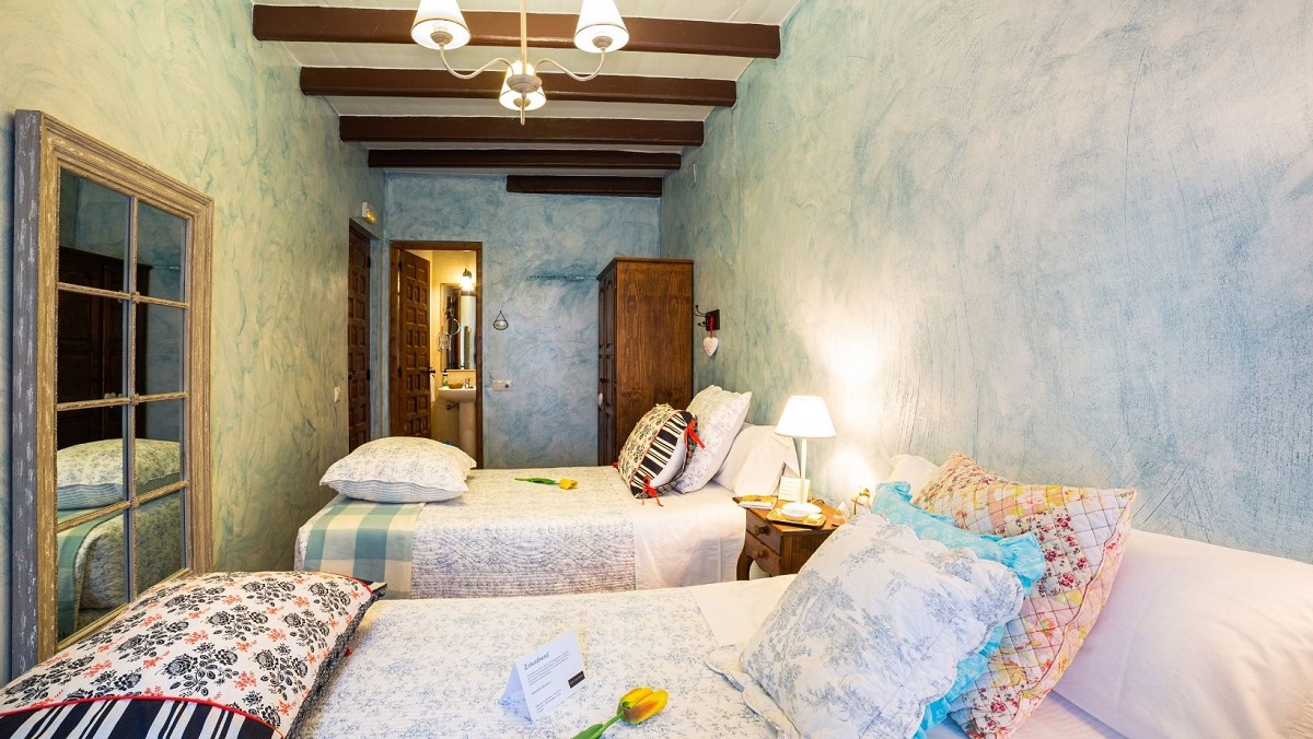 The window opens onto Calle Real, a discreet presence that reminds the guest that the house is part of the village and of its long, shared time.