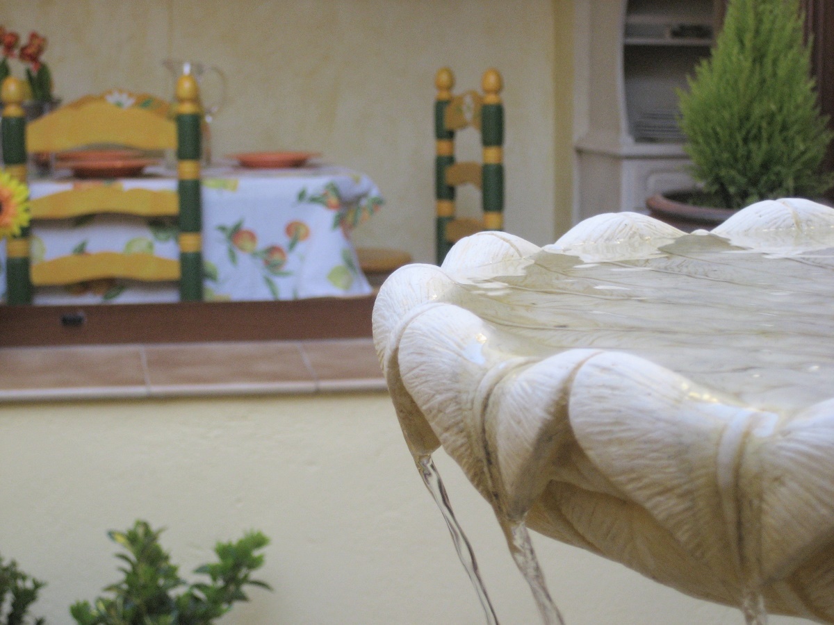 From this area there is direct access to the garden, and light enters both through the large windows opening onto the greenery and from the interior courtyard. The sound of water, coming from the Andalusian-inspired fountain, accompanies the rhythm of the space and creates a serene atmosphere that unifies the house.