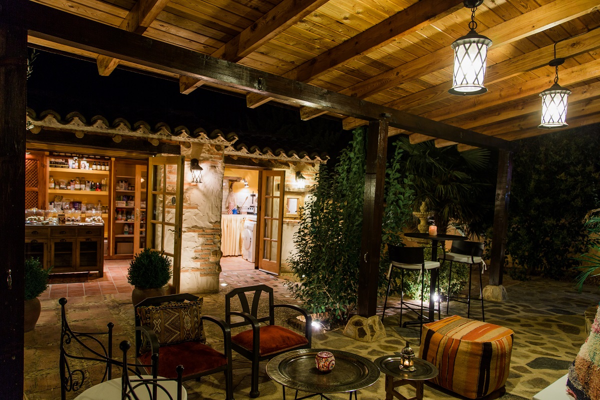 El porche es amplio para colocar mesas para un cátering. La vegetación de olivos, cipreses, bojs, rosales, naranjos, limoneros, rosales y palmeras y el sonido de las fuentes crean un entorno agradable y refinado.