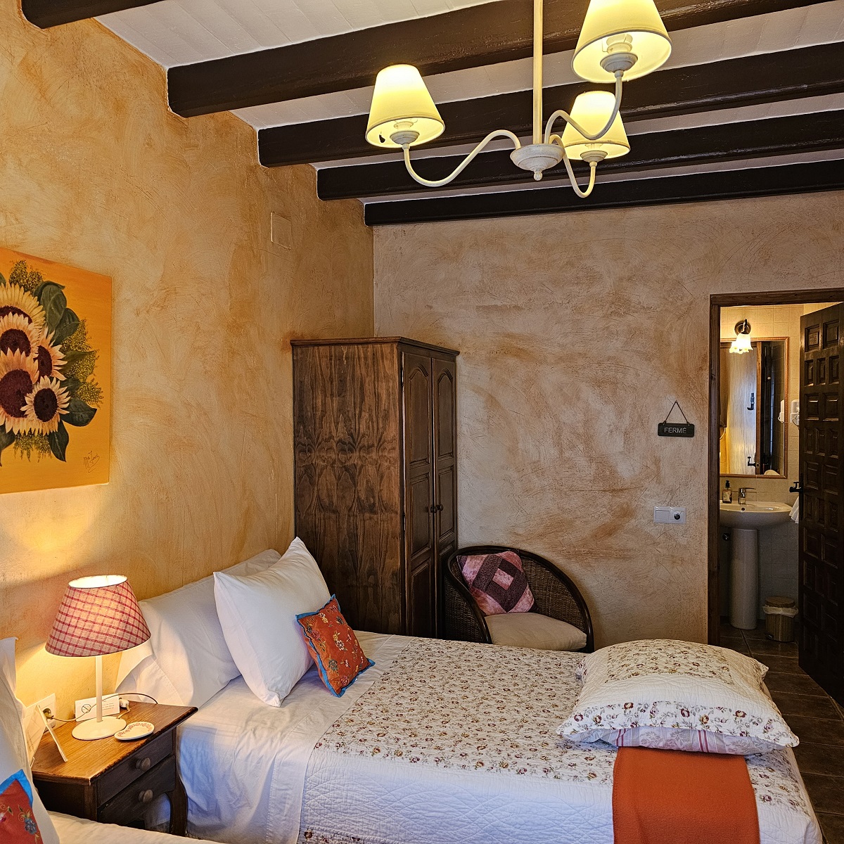 La habitación cuenta con dos camas de 1,90 x 90 cm, con colchones cómodos, almohadas, cojines y edredones a juego con los tonos naranjas de la habitación, pensados para crear un ambiente acogedor y tranquilo para el descanso.